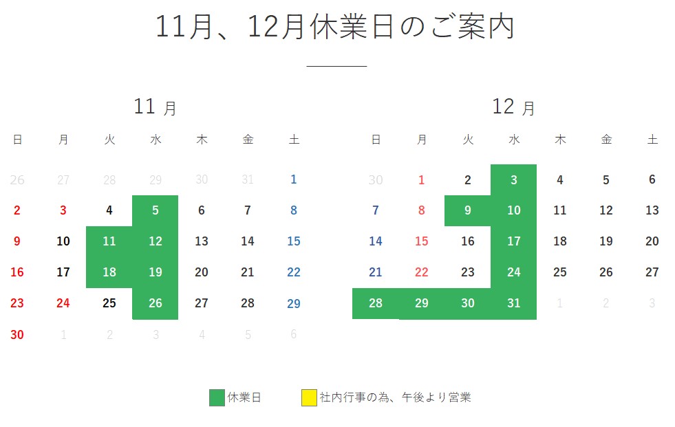 2025.09.01 【11月~12月】休業日のご案内 営業時間 10:00~19:00 ______________________________________________ この記事をShareする シェアする ツイート LINEで送る