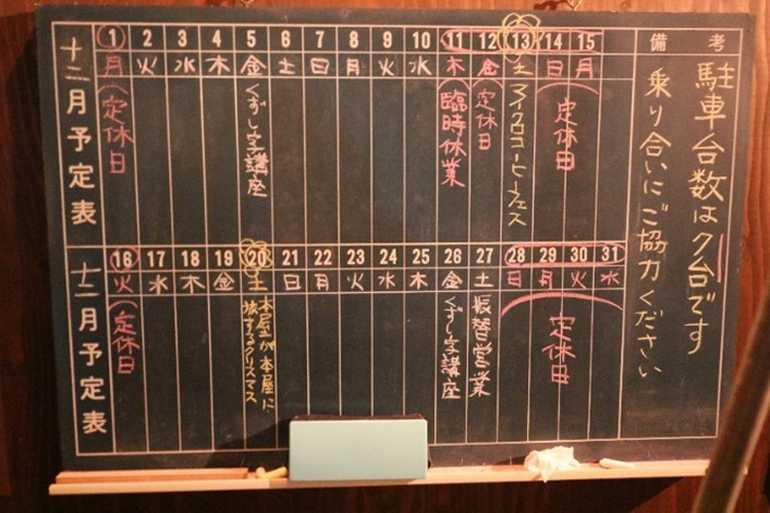 (入り口には営業予定が書かれた看板が設置されています。)