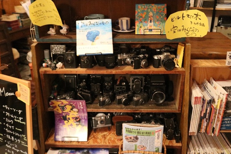 (レトロなカメラが棚にずらり)